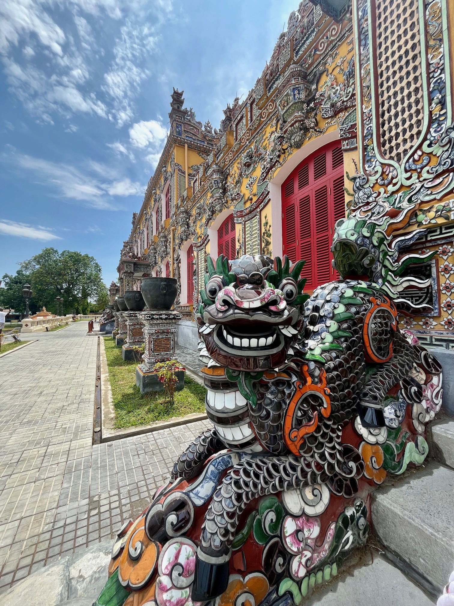 - Tumba de Khai Dinh: De estilo ecléctico, combina influencias vietnamitas y occidentales.